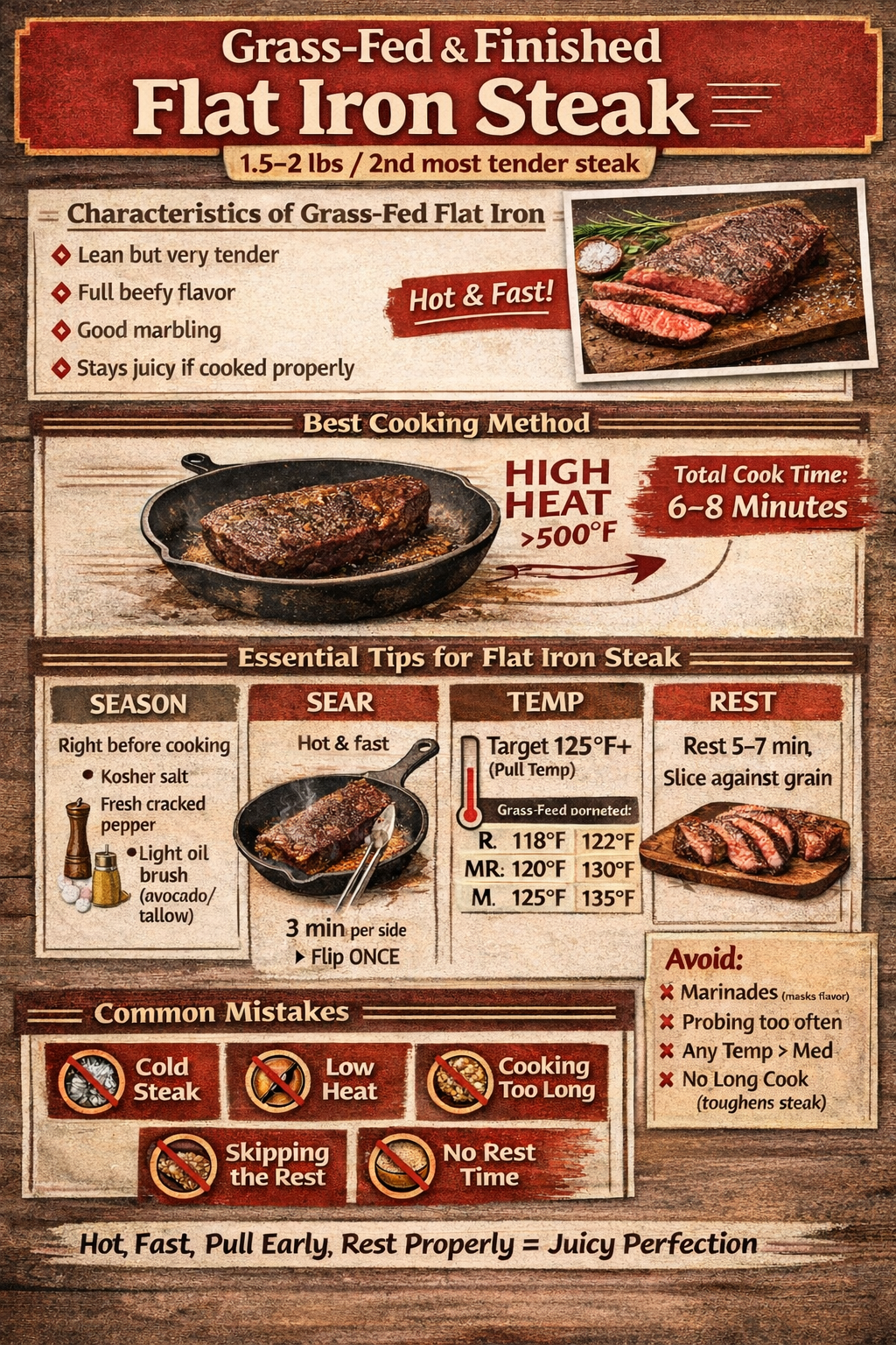 Flat iron steak is a cut from the shoulder (or chuck) of the cow. It's known for its rich flavor and tenderness, comparable to more expensive cuts like ribeye or tenderloin.